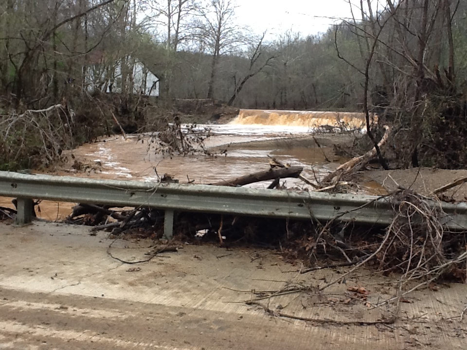 miraculously snagged on a stump which kept it from doing any damage. A canoe tied up behind the Mill was found across the creek, 20 feet up a tree. The county road running by The Mill had been stripped away down to the bedrock. What used to be the road was now in the midst of the creek, changing, perhaps forever, its flow.